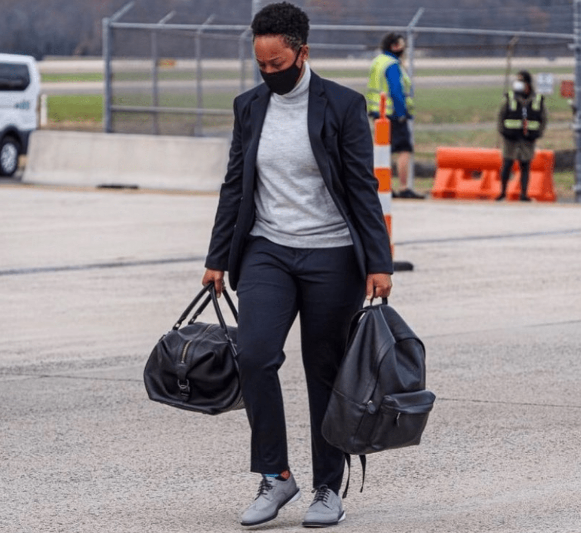 Jennifer put a swaggy spin on these classic wingtip shoes with the white sole. Paired with a tailored suit, festive scarf and two dope leather bags, this look is just the fit we’d expect from the fly coach.